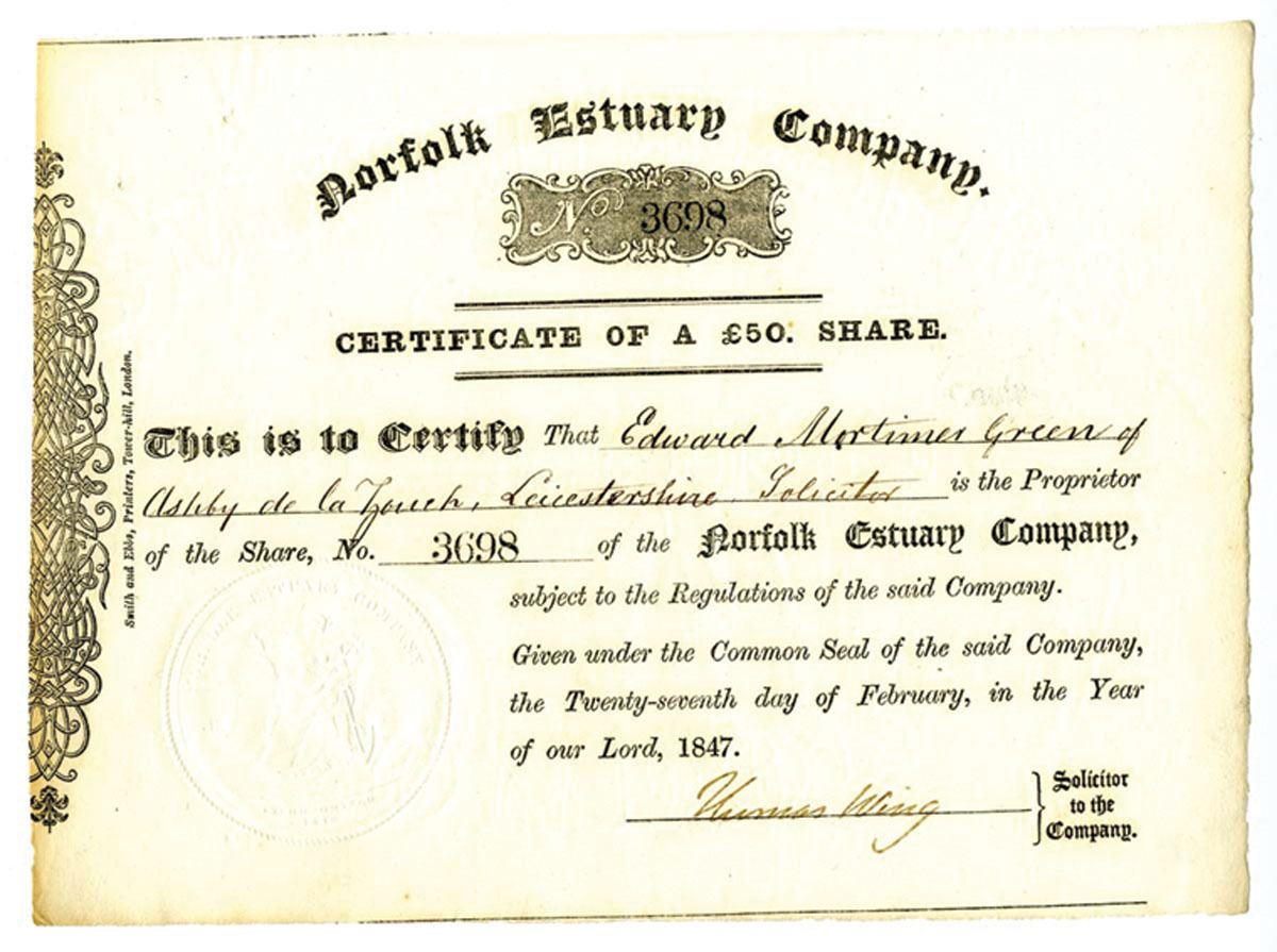 England. Norfolk Estuary Co., 1847 50 Pound Shr I/U Stock Certificate, Fine-VF. #3698, Smith & Ebbs. Incorporated in 1846.