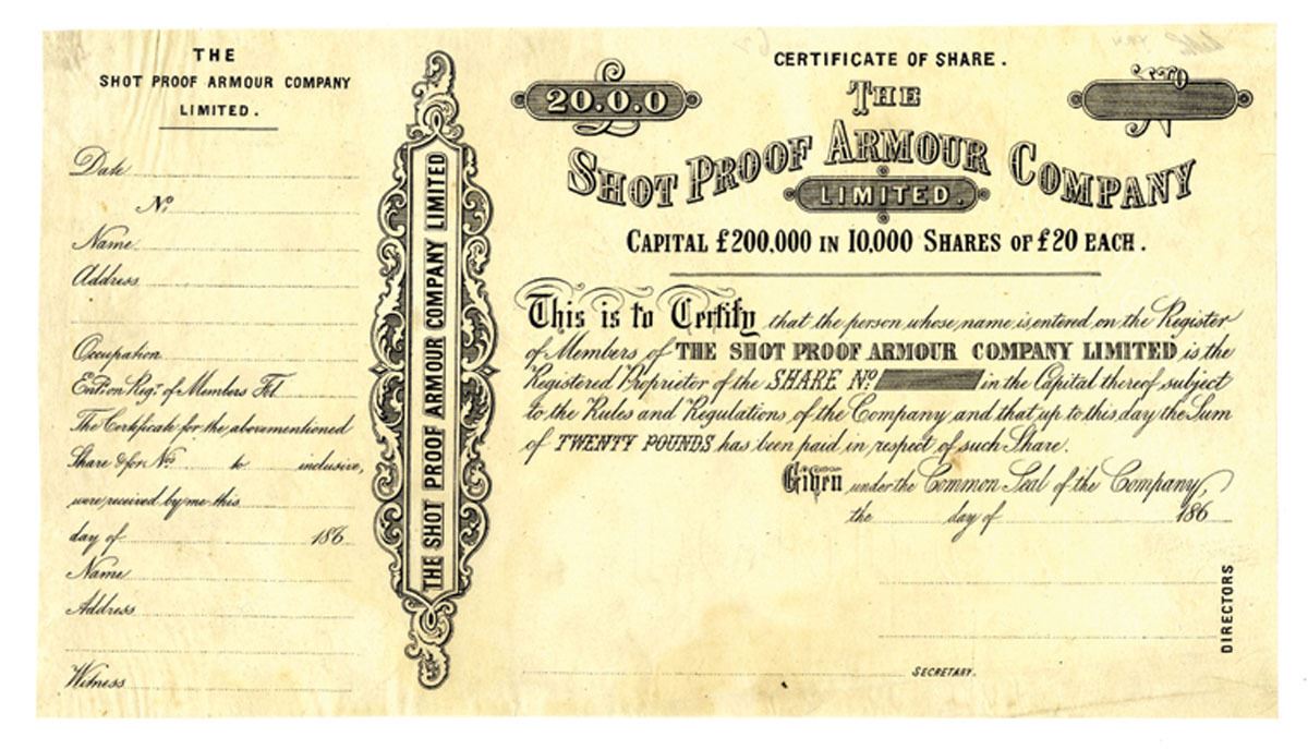 England, ca.1860-70s. Capital Stock Specimen Certificate. Black print with a simple black design on left side of certificate. VF-XF condition. Interesting military related certificate. The title speaks for itself.