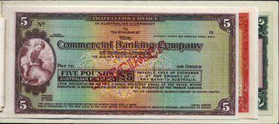 ca.1920-30's. Specimen sample book of traveler's checks printed and engraved by BWC. Booklet is 9 by 3.5 inches and has printed cover stating "Specimen of travelers Cheques - Engraved and Printed By Bradbury, Wilkinson & Co, Ltd., New Malden, Surrey, England". 12 different checks are bound into booklet by a small perforated tab. All are in choice uncirculated condition. Banks and companies included are "Thos.Cook & Son, Bombay, India"; "The National Bank of Australasia, Ltd."; "Australia and New Zealand Bank, Ltd"; "Hambros Bank, Ltd"; "Rafidain Bank, Baghdad, Iraq"; "Midland Bank", London; "El Banco De Credito del Peru"; "The British Bank of Iran and the Middle East"; "The Commercial Banking Company of Sydney"; "The Commercial Bank of Scotland"; "The Bank of New Zealand"; "Lloyds Bank" and another "Midland Bank". All are uniface with no backs. All have red specimen overprints with POC's. The issued checks probably did have backs printed. Rare and attractive specimen booklet with rare banks included. BWC.