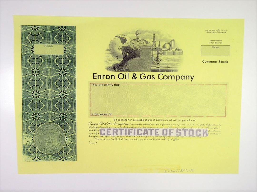Texas. Enron Oil & Gas Co., 1985 Unique Production Proof - Mockup Stock Certificate, XF SC-USBN. Its bankruptcy in December 2001 was the largest such filing in United States history. The name Enron became synonymous with corporate greed and corruption, and its demise cost investors and employees over $70 billion in lost capitalization and retirement benefits. Kenneth Lay, CEO of Enron. Unique Production Proof-Mockup with "Certificate of Stock" pasted on the middle of the stock. SC-USBNC