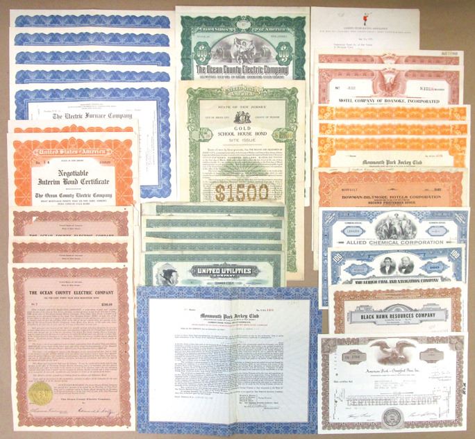 Various States, ca.1900-1980. Lot of 55+ Stock and Bond Certificates, Includes: Virginia, Motel Co. of Roanoke, Inc.; Garden State Racing Assoc. letter; Monmouth Park Jockey Club; W. T. Grant Co.; Gulf, Mobile and Ohio Railroad Co.; Pennsylvania Railroad Co.; All-State Credit Corp.; Contemporary Kitchen Doors, Inc.; Eaton & Howard Balanced Fund; American Telephone and Telegraph Co.; North Butte Mining Co.; State of New Jersey Gold School House Bond; Electric Furnace Co. and more. Certificates range from Fine to XF condition. (60). Sold "AS IS" no returns accepted.