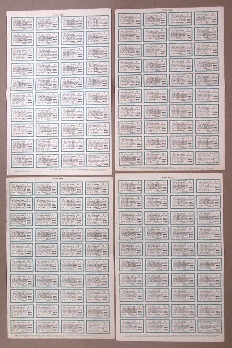 New York, ND (1900-1920s). Lot of 4 $1000 Specimen 5% Gold Bonds, Black with Teal/Green border and gold undertint, Pair of allegorical women at top with eagle. Specimen overprints, 00000 serial numbers, XF condition. ABNC. Very attractive bond with large vignette and multiple pages. (4). Sold "AS IS" no returns accepted.