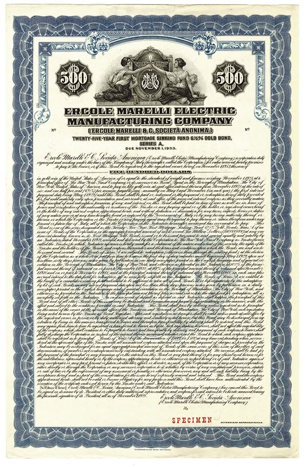 Italy, 1928, Vertical $500, 25 Year 1st Mortgage Sinking Fund 6 1/2% Gold Specimen Bond, Series A, due November 1, 1953, Blue border with allegorical women holding light bulb, Specimen overprints, POCs, Coupons attached, HBNC, F condition