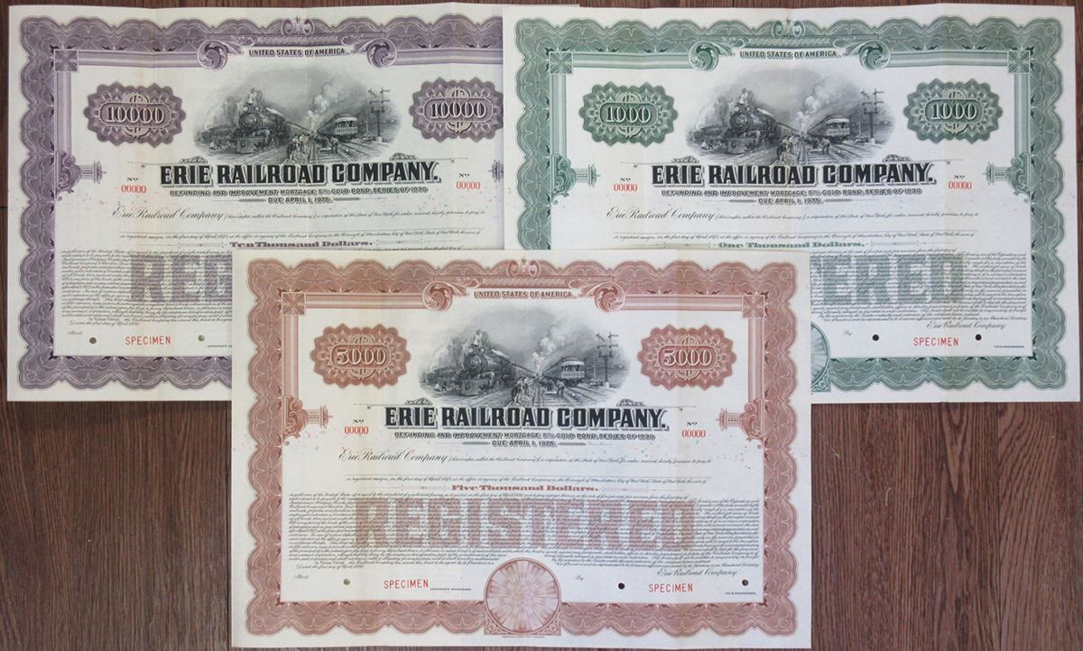 New York, 1930. Lot of 3 Specimen, Registered Bonds from the 1930 series: Includes $10,000 Specimen 5% Registered Gold Bond in Purple; $1000 Specimen 5% Registered Gold Bond in Green; and, $5000 Specimen 5% Registered Gold Bond in Brown. All are Refunding and Improvement Mortgage Bonds, Red specimen overprints, 00000 serial numbers, POCs, VF condition, ABNC. All are Rare and only known as specimens in Cox. (3)