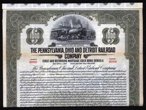 1895, $1,000. First Consolidated 4% Mortgage Deed bond. Olive border w/ locomotive at station flanked by cherubs. ABNC. Specimen w/ coupons, VF. Scarce bond variety from this notorious railroad. Incorporated in 1832 and completed in 1851, the Erie became known as "the scarlet woman of Wall Street" in the mid-19th century, when it was the object of financial struggles between Daniel Drew, Jay Gould, James Fisk, and Cornelius Vanderbilt. Manipulations of its stock by Gould and Fisk became notorious.