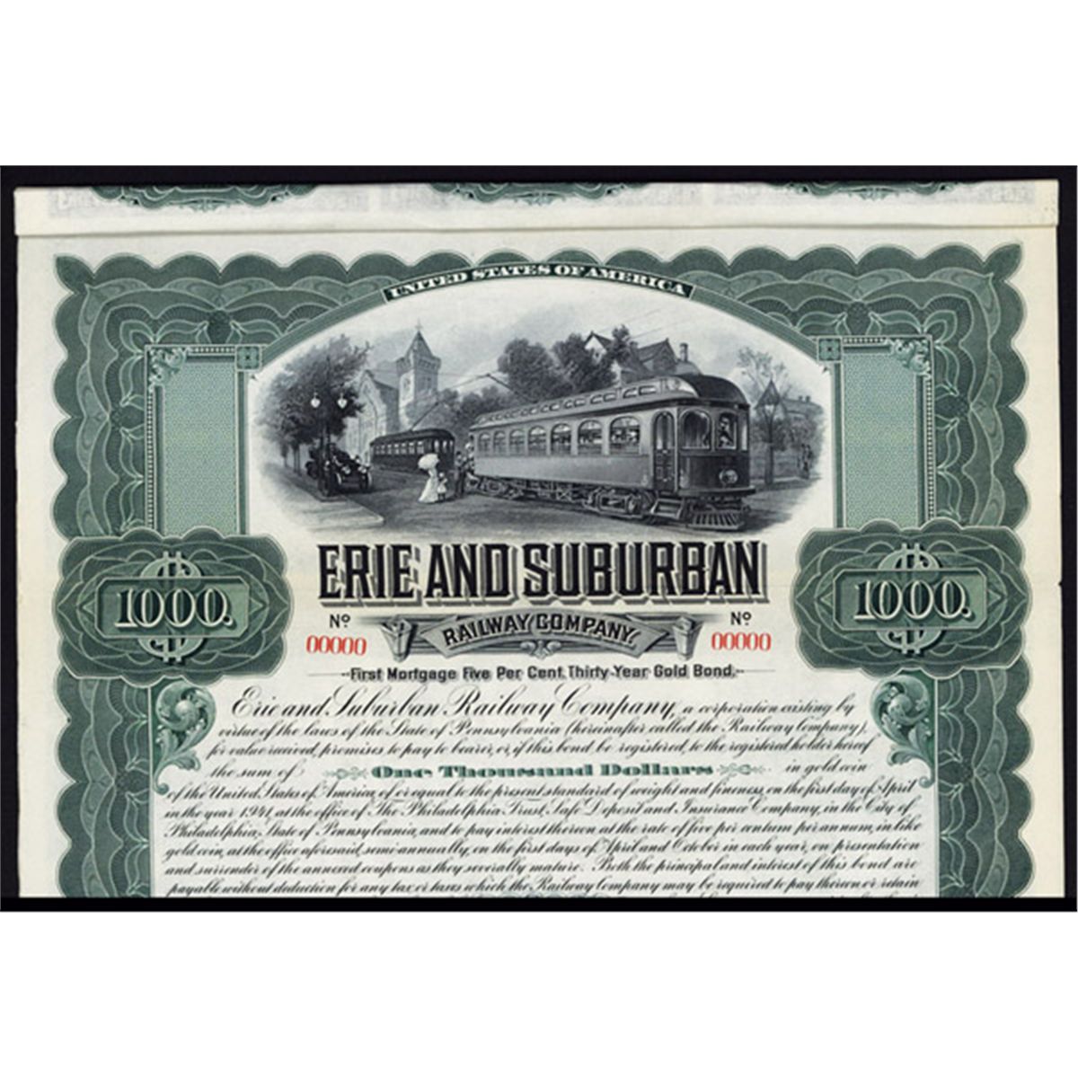 Pennsylvania, 1911, $1000, 1st Mortgage 5% 30-Year Gold Bond, Specimen, Black on green border and underprint, Trolley top center dropping off passengers, Coupons attached, VF-XF condition, ABNC.
