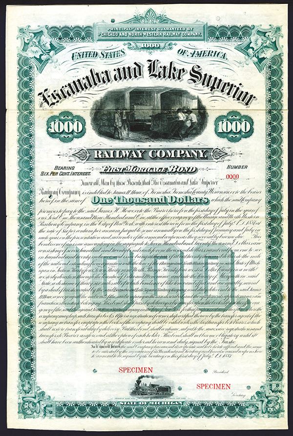 Michigan. 1881. $1000 1st Mortgage 6% Specimen Bond. Black print with green border and underprint. Mining vignette top center with small vignette bottom center of moving locomotive. POC's and red SPECIMEN overprints. VF condition. ABNC. Listed railroad in Cox but bond only listed in proof.