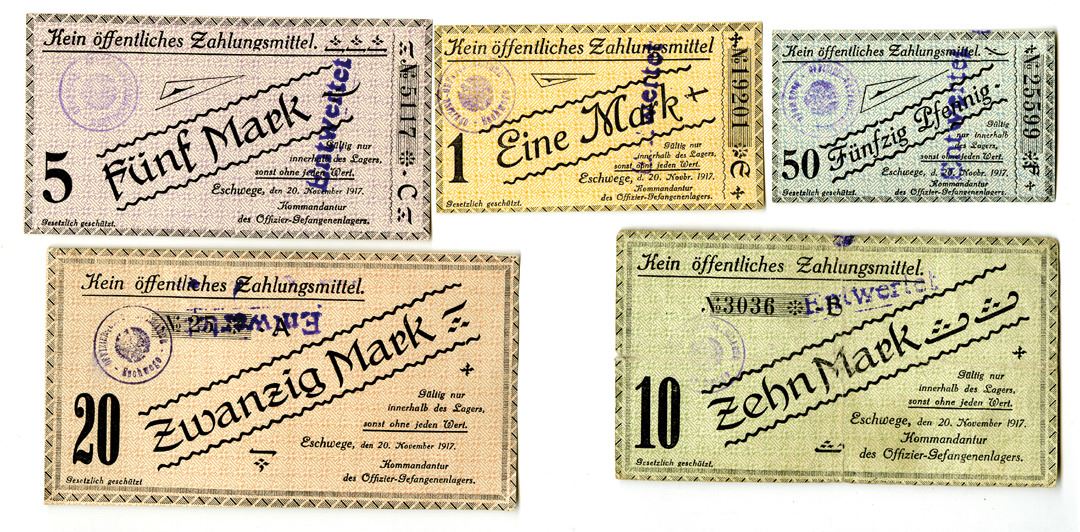 Germany, 1917. Lot of 5 Issued POW Notgeld Banknotes for use in the Eschwege Prisoner of War Camp, P-Unlisted. Includes: 50 Pfennig; 1 Mark; 5 Mark; 10 Mark; and 20 Mark, all with handstamps. Unc to CU condition. (5)
