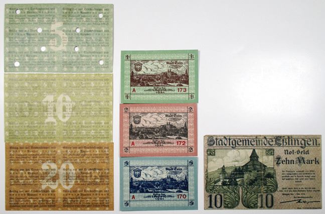 Germany. 1918, Lot includes 7 notes from Esslingen 10 Mark with eagle and embossed circular seal at left; deom Exin (Kcynia, Poland) a trio of 1, 2, and 5 Mark Notgeld; and from P_¤neck a trio of 5, 10, and 20 Mark, the 5 with POCs. Esslingen 10M is Fine, the rest XF to AU. (7)