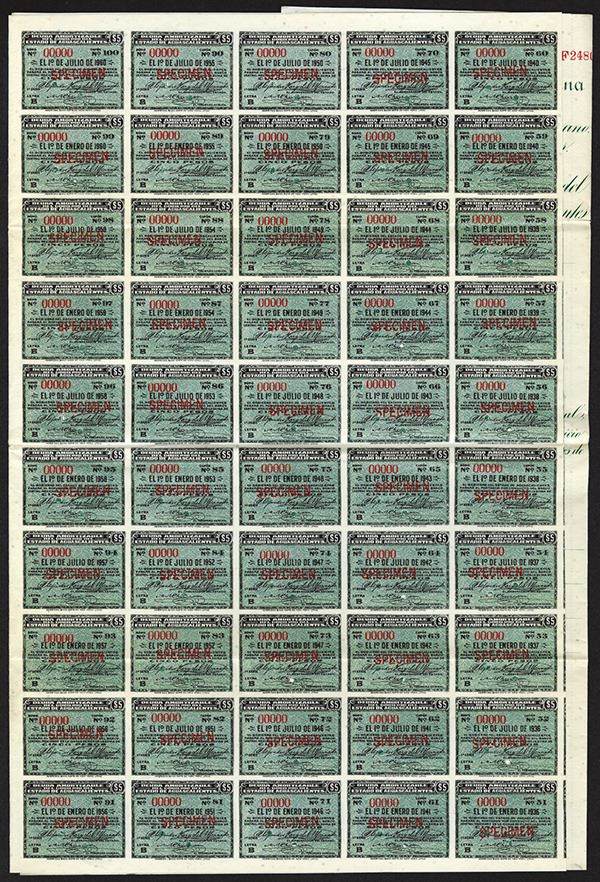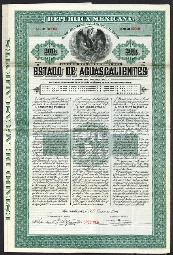 Aguascalientes, Mexico. 1910. Specimen bond. 200 Pesos. Ser.B. Green border and undertint. Vignette with arms of Mexico. Coupons attached. Red specimen overprint. VF condition. ABNC. Scarce bond.