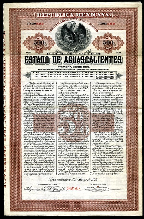 Estado De Aguascalientes, 1910 Specimen Bond. Aguascalientes, Mexico. 1910. Specimen bond. 500 Pesos. Ser.C. Brown border and undertint. Vignette with arms of Mexico. Coupons attached. Red specimen overprint. VF condition. ABNC. Scarce bond.