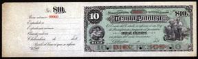 Chihuahua, Mexico. 18--, (ca.1870-80's). 10 Pesos, P-Unlisted, Specimen banknote. Black on green underprint with vignette of men working on right and children on left, back green with Arms of Mexico. Red specimen overprint, POC and "00000" serial numbers. Counterfoil on left. Text on circulating bond states "El Erario del Estado conforme a su Ley de Presupuestos pagara al portador - Diez Pesos - en plata del cuno Mexicano". Uncirculated condition with extremely light toning on right corners. ABNC. Rare, attractive and a prize for any collector of trophy Mexican banknotes. The first example sold for $2500 with the Buyer's Premium in our second auction in October, 2007. This is the last opportunity to purchase an example of this amazing note.