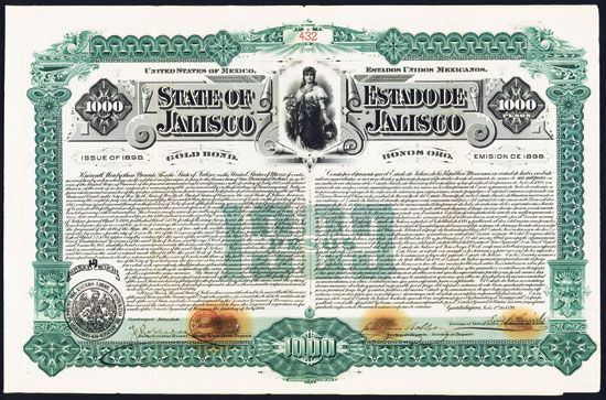 Guadalajara, Mexico, 1898, $1000 Gold Bond, S/N 432, Black pn green border and underprint, Allegorical woman with Cadaceus in middle, the bond appears VF but unfortunately there is ink burn due to a foreign substance in the signature areas that detracts from the appearance. WBNC.