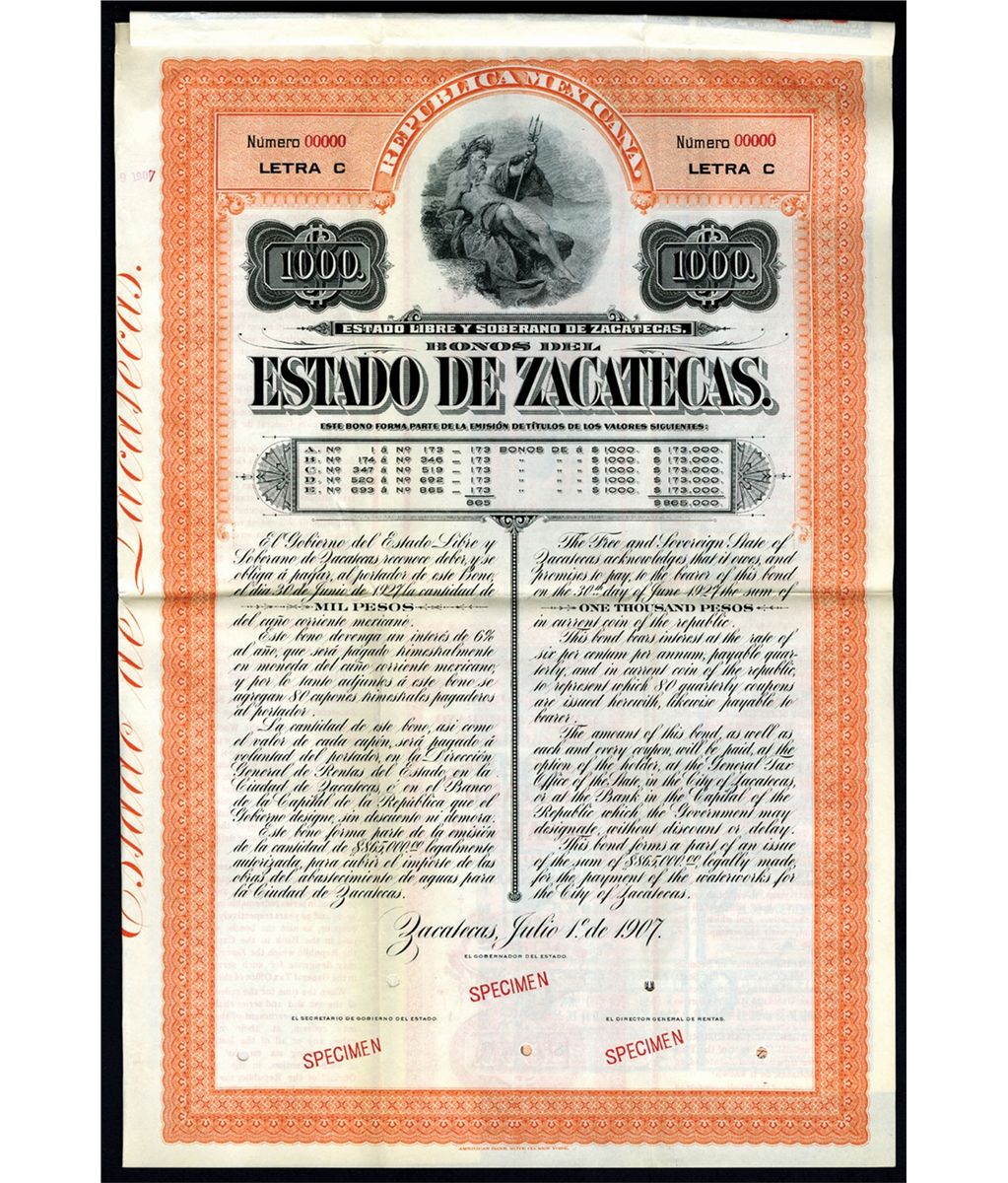 Zacatecas, Mexico. 1907. Specimen bond. 1000 Pesos. Letter C, Orange border. Vignette with Neptune seated with trident. Coupons attached. . XF condition. ABNC. Rare bond.