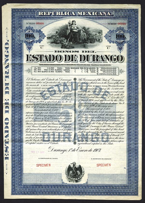 Durango, Mexico. $100 Pesos Specimen Bond, Series C, blue frame, woman seated, agricultural products, eagle and snake below. ABNC, EF overall, with a few minor edge splits at the top. Scarce.
