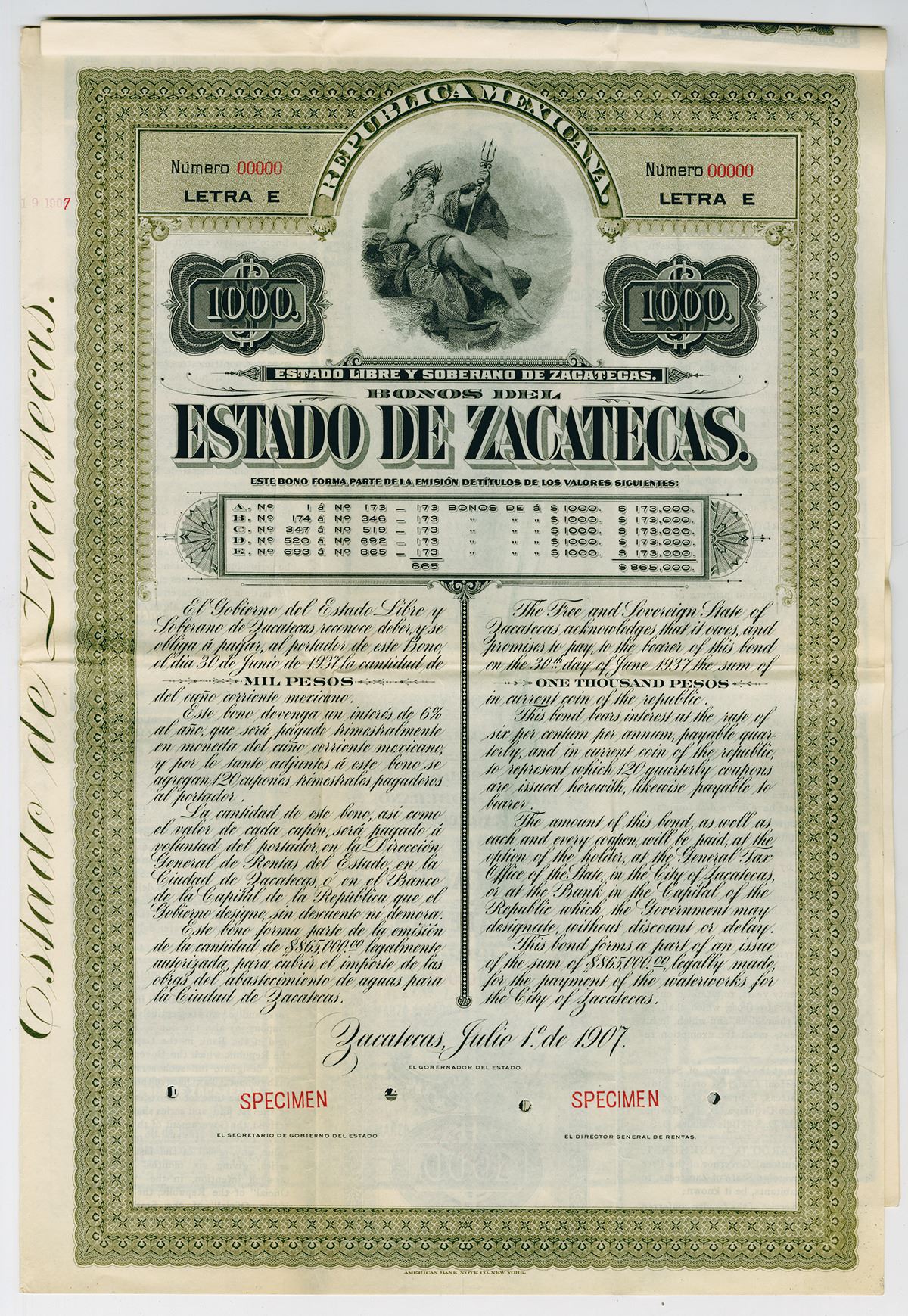 Zacatecas, Mexico. 1,000 Pesos Letra E Specimen Coupon Bond, Olive green border, Neptune with trident in circular frame, Specimen overprints and POC's, VF-XF condition, ABNC. Rare and dramatic appearing bond.