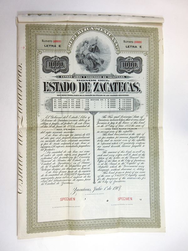 Zacatecas, Mexico. $1000 Pesos Specimen Bond, Series E, Olive Green frame, Neptune with trident in circular frame, XF. ABNC