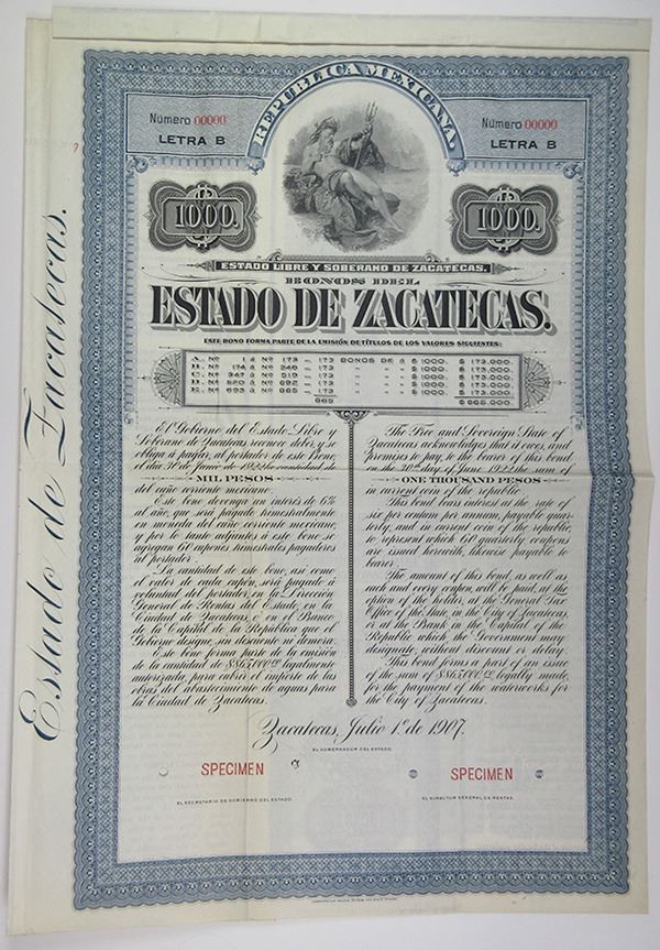 Mexico, 1907, 1000 Pesos, 6% Specimen Bond, Red SPECIMEN overprints and POC's, red s/n "00000", Vignette top center of a reclined god of Neptune on rock holding a trident, VF condition, ABNC.