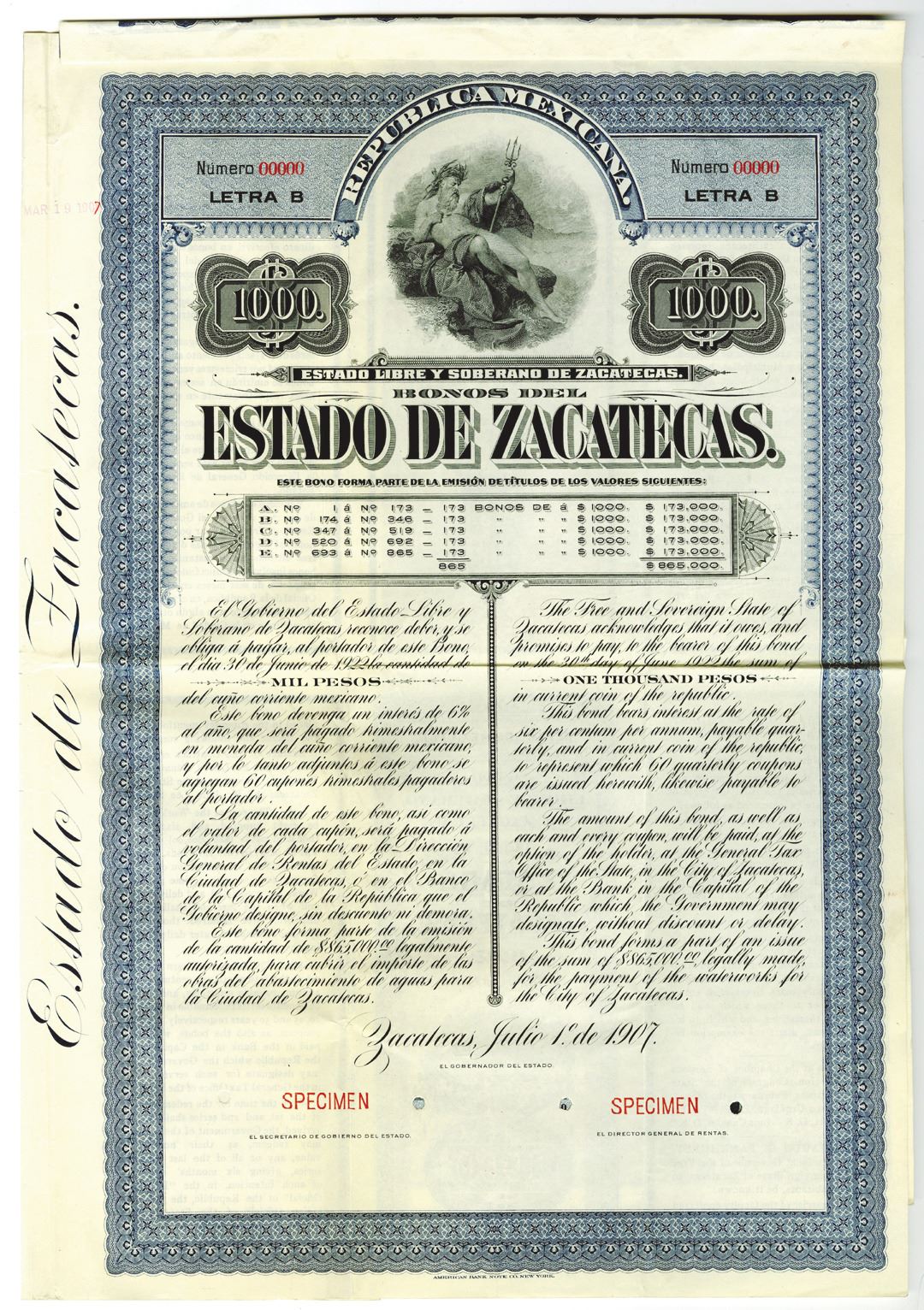 Zacatecas, Mexico. $1000 Pesos Specimen Bond, Series B, Blue frame, Neptune with trident in circular frame, XF. ABNC. Rare and dramatic appearing bonds.