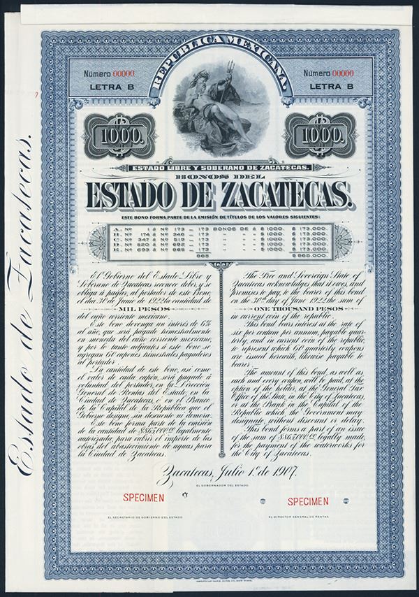 Mexico, 1907, $1000, 6% Specimen Bond, Red SPECIMEN overprints and POC's, red s/n "00000", Vignette top center of a reclined god of Neptune on rock holding a trident, VF condition, ABNC.