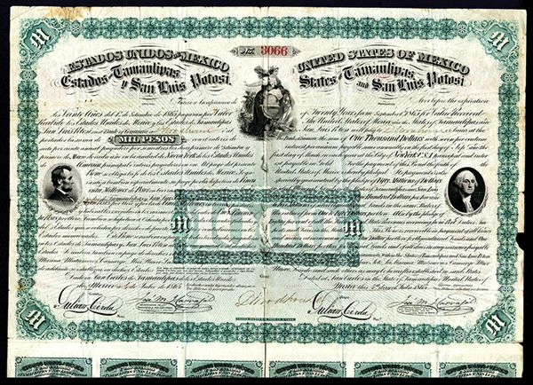Estados De Tamaulipas y San Luis Potosi, 1000 Pesos Issued and Uncancelled "2 Presidents" Bond with Lincoln & Washington. San Carlos, Tamaulipas, 1865, 1000 Pesos, Issued and Uncancelled Bond, 20 coupons attached, Lincoln and Washington vignettes on left and right with allegorical woman top middle, Black on green border and underprint, VG condition with archival reinforcement, Amazing "2 Presidents" Bond, U.S. BNC, NY.