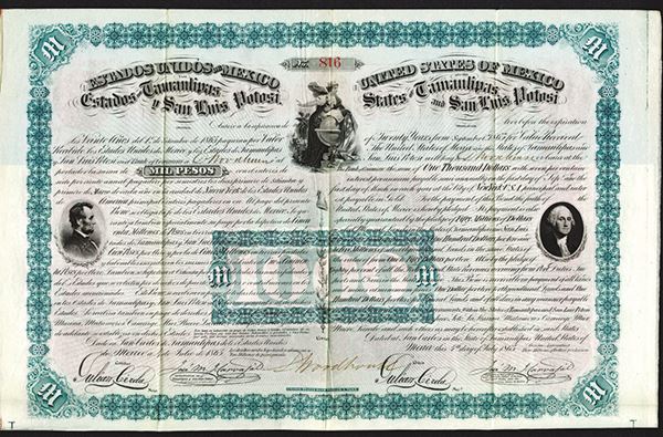 San Carlos, Tamaulipas, 1865, 1000 Pesos, Issued and Uncancelled Bond, 20 coupons attached, Lincoln and Washington vignettes on left and right with allegorical woman top middle, Black on green border and underprint, VG condition with archival reinforcement, Amazing "2 Presidents" Bond, U.S. BNC, NY.