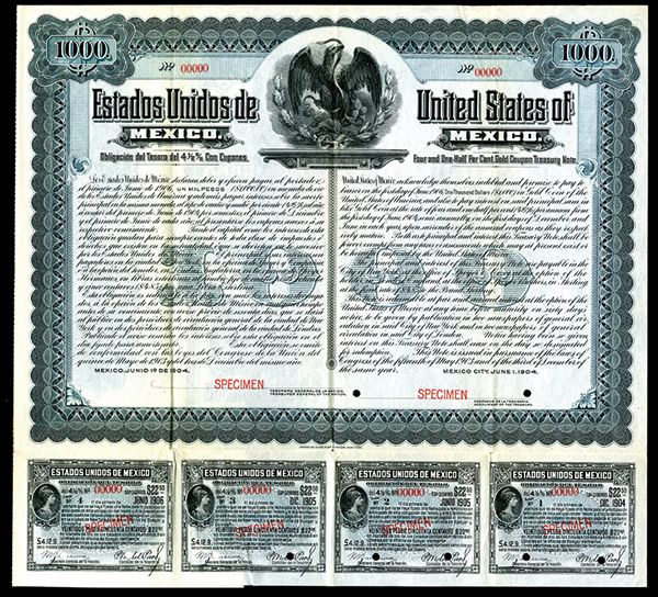 Estados Unidos De Mexico - United States of Mexico, 1904 Specimen Bond. Mexico. 1904. $1000, Specimen 4 1/2% Gold Coupon Treasury Bond. Slate blue border and undertint. Arms of Mexico. Red SPECIMEN overprint and POC. Coupons attached. XF Condition. ABNC. In English and Spanish.