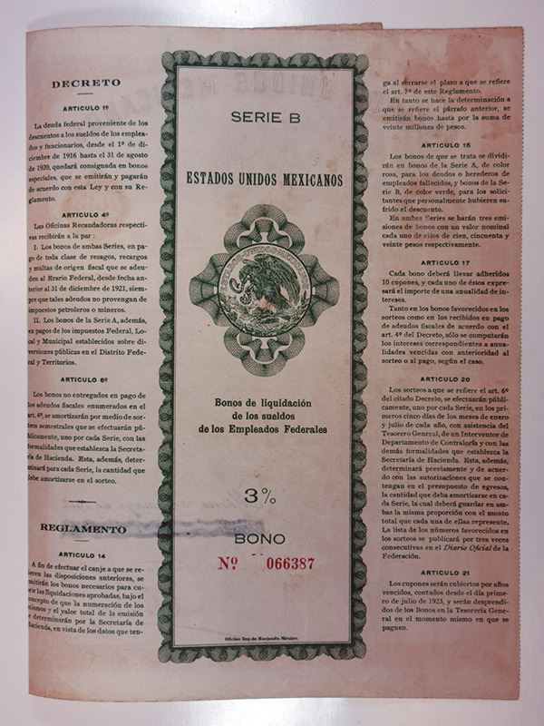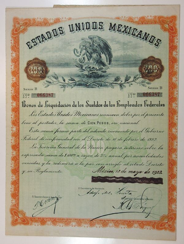 Mexico, 1923, 100 Pesos, Series B, I/U, 3%, Dark blue on light blue underprint and orange border, Mexican arms of eagle with snake on cactus in middle, S/N 066387, Coupons attached, VF condition. Attractive and scarce bank bond. Local printer.