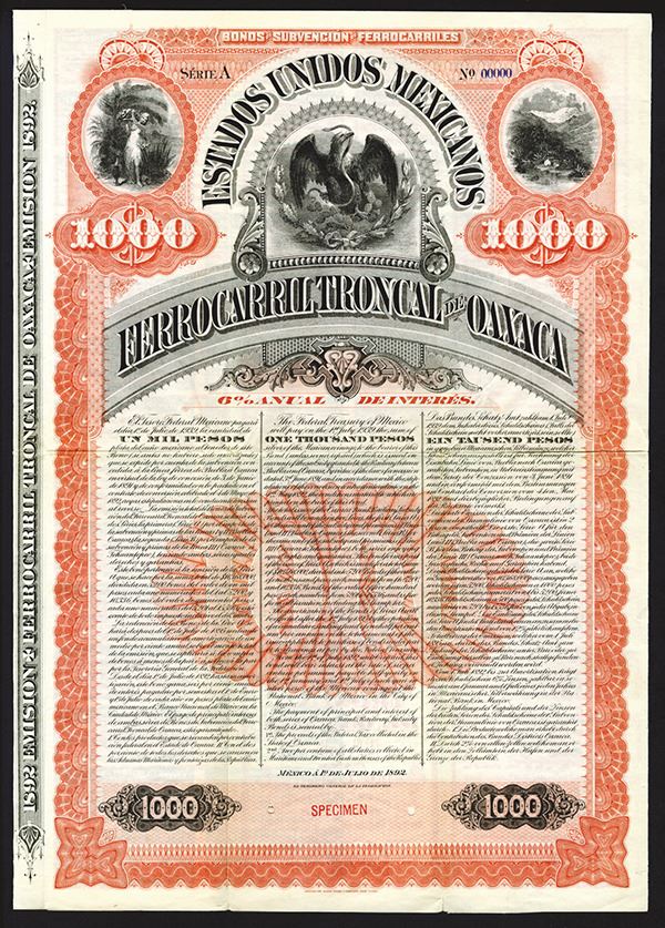 Oaxaca, Mexico, 1892, 1000 Pesos, Specimen 6% Bond, Orange border with Arms of Mexico (eagle with Snake) and allegorical topical vignettes on upper left and right. Extremely rare Oaxaca railroad bond. Printed in English, Spanish and German on front. Red specimen overprints, "00000" serial numbers and POC's, Coupons attached, the bond appears XF with great paper quality, but there are 2 small holes in the middle where the bond had been folded and stored that do not detract from the appearance or rarity, ABNC. Unlisted railroad in Cox.