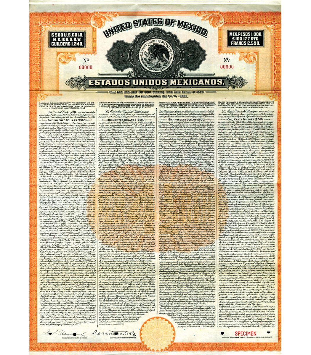Mexico, 1926. 4 1/2% Gold Bond. Specimen bond. $500 U.S. Gold plus it is listed in 5 other currencies. Orange border and undertint. Arms of Mexico. Red SPECIMEN overprint and POC. Coupons attached. XF Condition. ABNC. In 4 different languages.