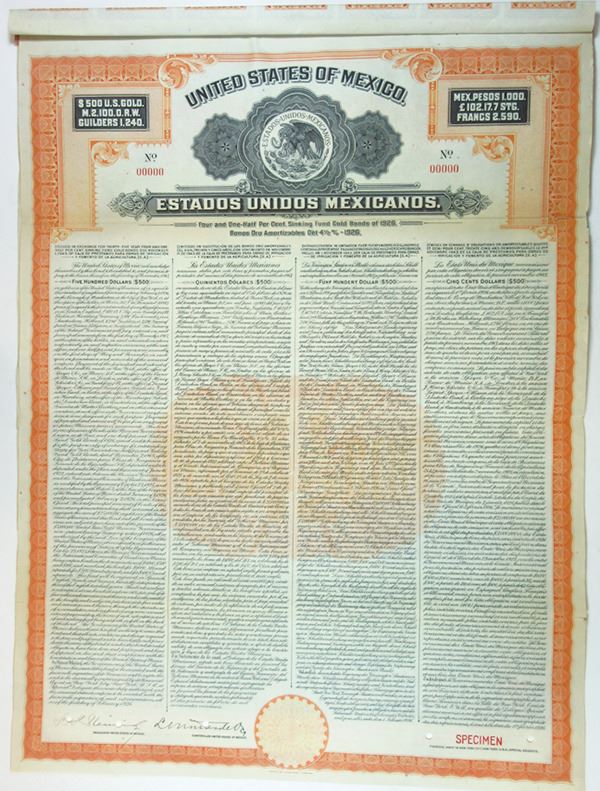 Mexico. $500 Specimen 4 1/2% Sinking Fund Gold Coupon Bond. Black print on large ornate orange border printed on oversized certificate, with orange under tint printed in English, French, German, and Spanish, Arms of Mexico at top, Specimen ovrprint and POC. VF-XF condition with splitting at fold lines. ABNC.