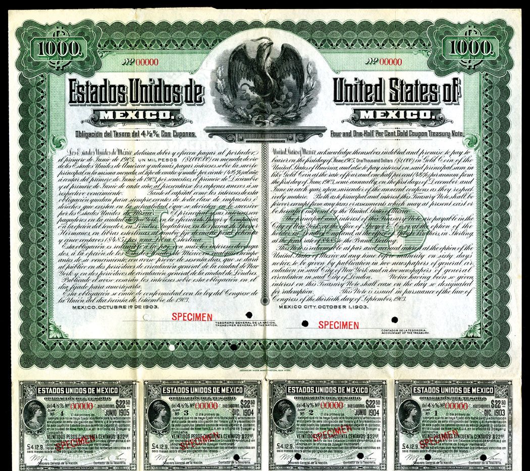 Mexico City, Mexico. 1903. 4 1/2% Gold Coupon Treasury Note. Specimen bond. Green border and undertint. Arms of Mexico. Red SPECIMEN overprint and POC. Coupons attached. XF Condition. ABNC. In 2 different languages.