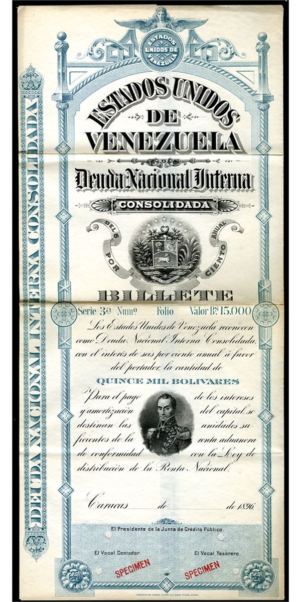 Caracas, Venezuela. 1896. 1000 Bolivares. Ser.8a. "Deuda Nacional Interna Consolidada". Ornate blue border with winged woman on top, ornate title with arms of Venezuela and vignette of Bolivar below arms. Coupons attached. XF condition. Red specimen overprint and POC's. ABNC. Scarce bond.