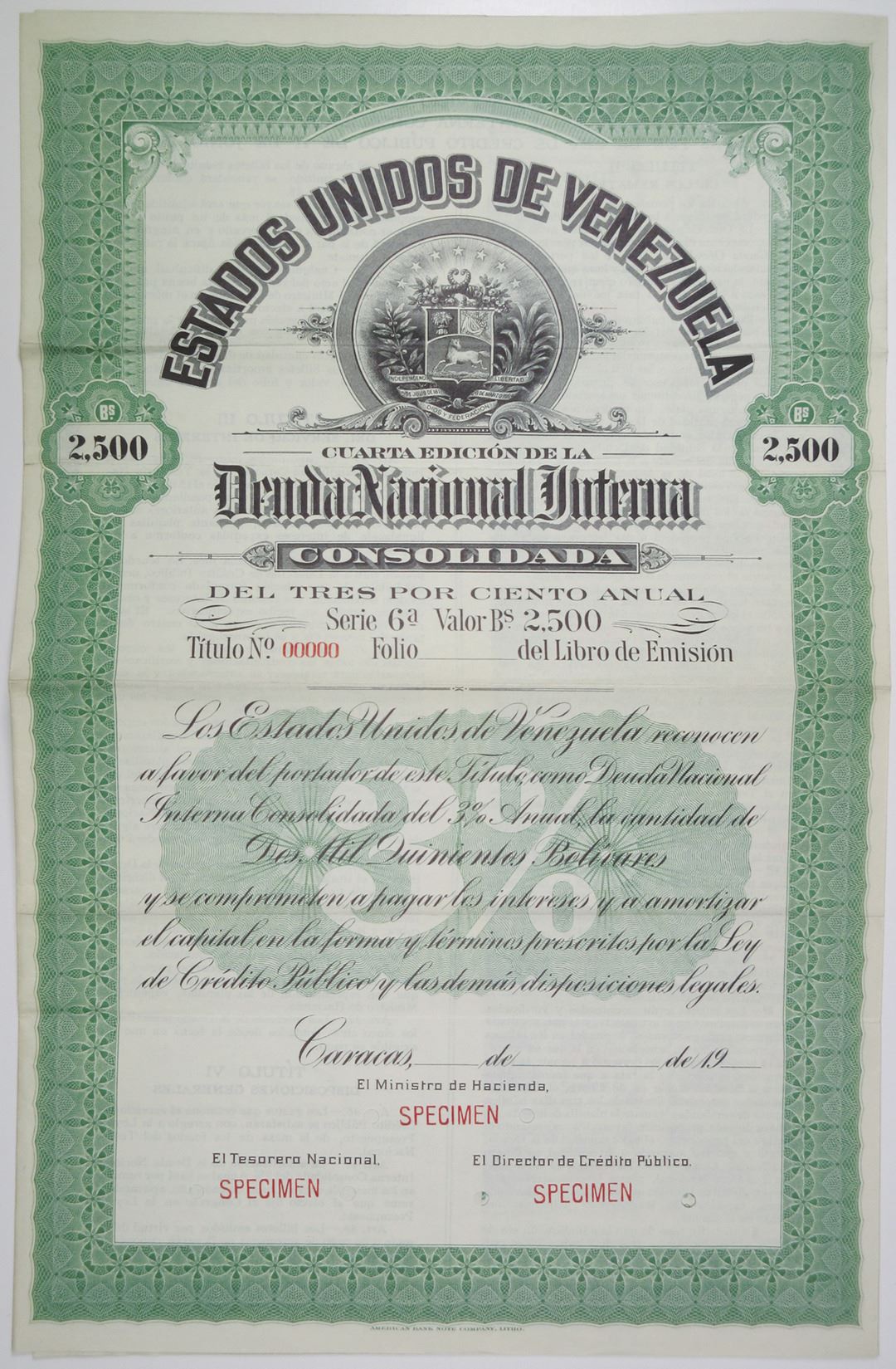 Venezuela, ND (1940s). 2,500 Bolivares Specimen 3% Bond in Spanish, Black text with green border, Venezuela seal at top center. Red specimen overprints, 00000 serial numbers, and POCs. Fine-VF condition, ABNC.