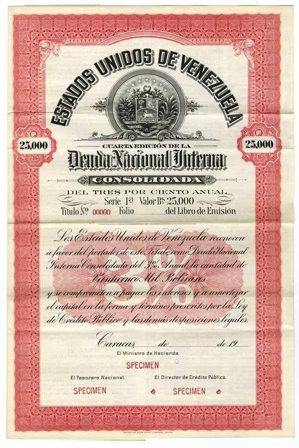 Caracas, Venezuela. 25,000 Bolivares. 3% Consolidated Series 1a bond. Red border with arms of Venezuela. ABNCO. Specimen w/coupons, XF. Rare high denomination specimen bond.