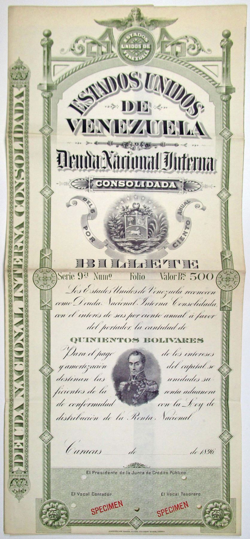 Caracas, Venezuela, 1896. 600 Bolivares Specimen 6% Coupon Bond in Spanish, Black text with olive border, Coat of arms of Venezuela depicted at center, Simon Bolivar depicted at center near bottom. Red specimen overprints and POCs. Fine-VF condition, ABNC.