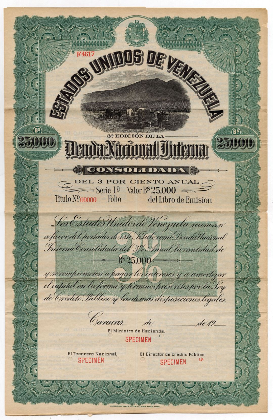 Venezuela. 25,000 Bolivar Specimen 3% Coupon Bond, Black print on large green border and under tint, Men plowing field with cattle at top, Specimen overprints and POC's, Fine condition with splitting along fold lines, ABNC.
