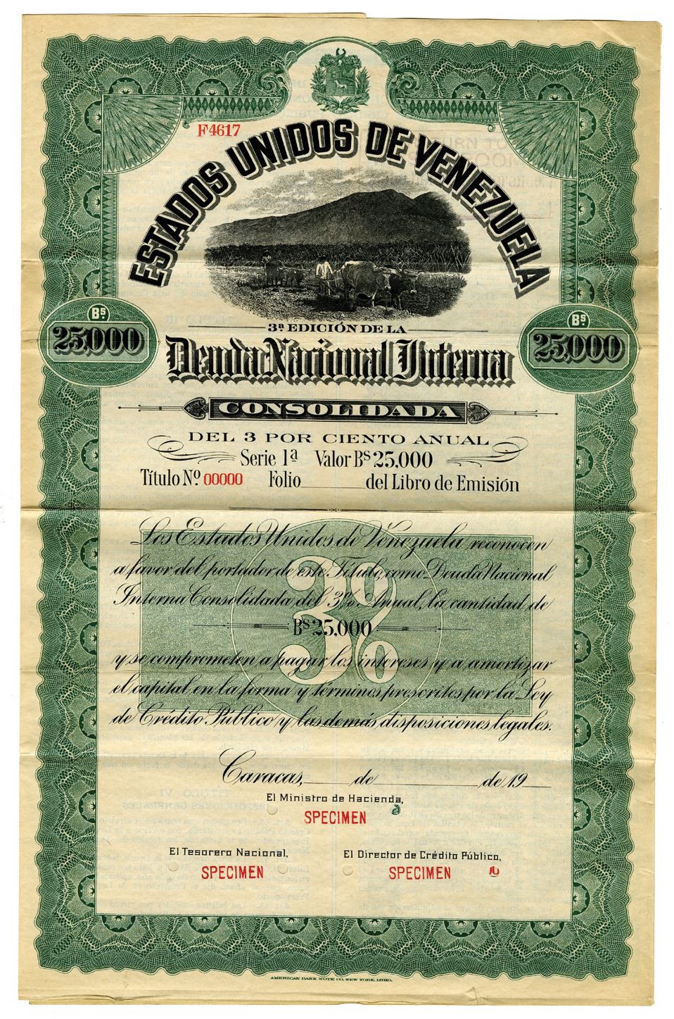 Venezuela. 25,000 Bolivar Specimen 3% Coupon Bond, Black print on large green border and under tint, Men plowing field with cattle at top, Specimen overprints and POC's, Fine condition with splitting along fold lines, ABNC.