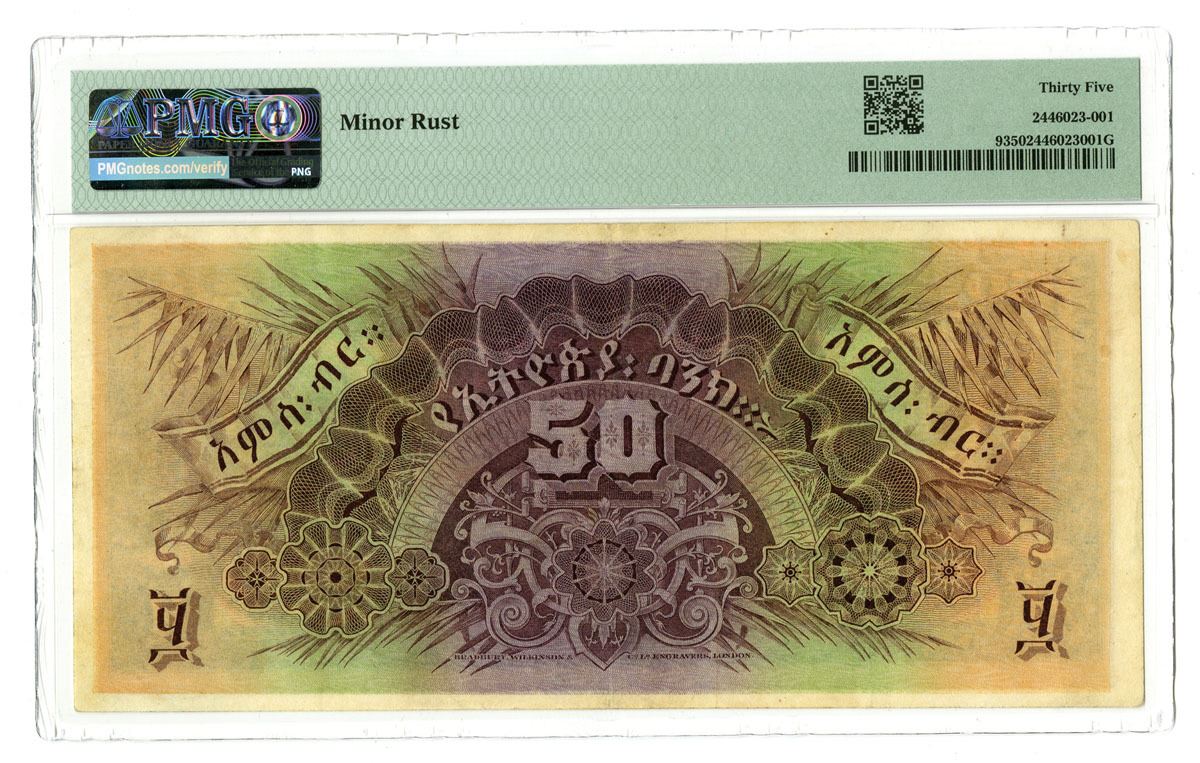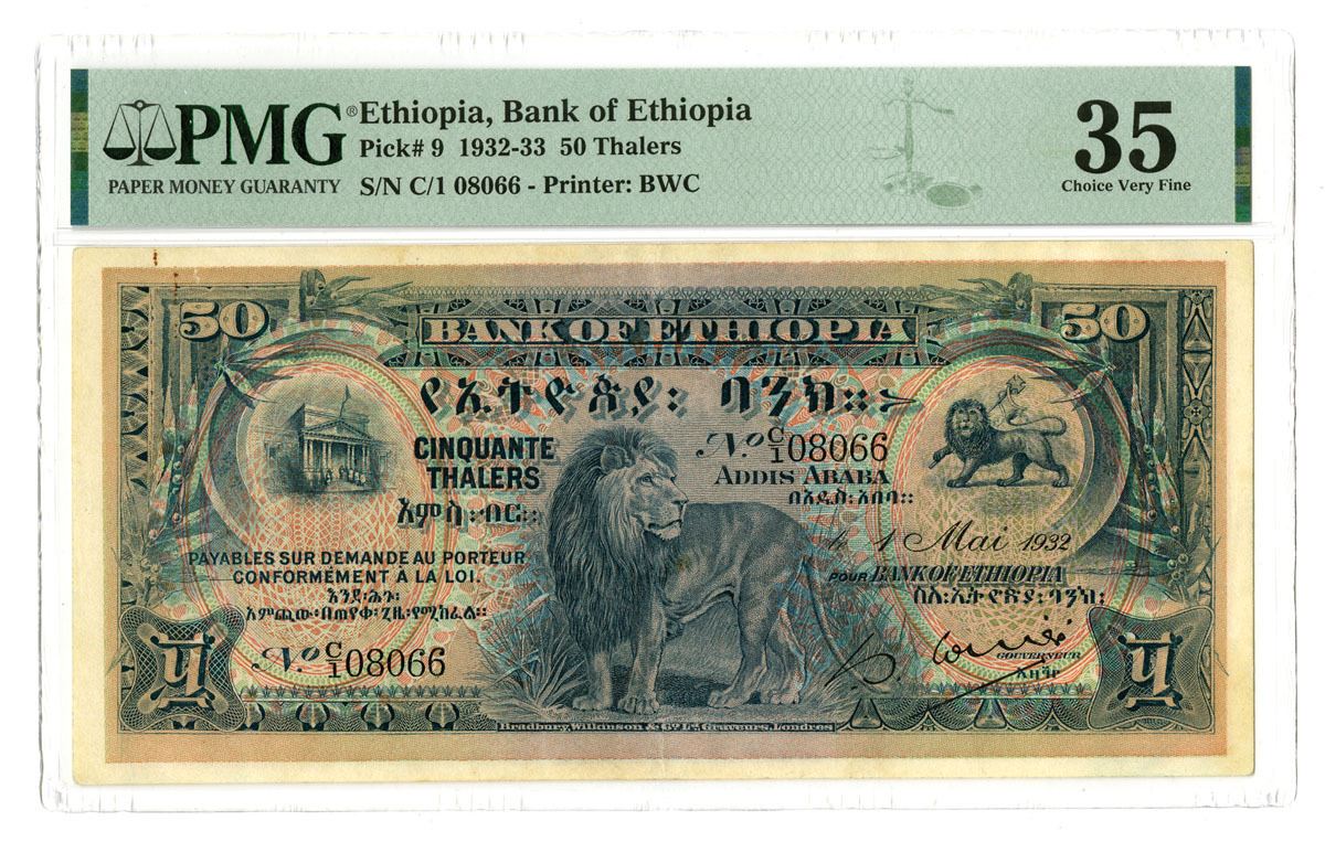 Ethiopia…., 1932. 50 Thalers, P-9, Issued Banknote, Blue-green on m/c underprint, Lion at center with bank building at upper left and arms at right, Back is m/c, S/N C/1 08066, PMG graded Choice Very Fine 35 with comment "Minor Rust," BWC. This is the highest graded example to be offered at auction since 2022, where 2 different examples sold for over $2000 each, one graded a PMG 20 and the second graded PMG 45. A lovely note that is sure to attract attention.