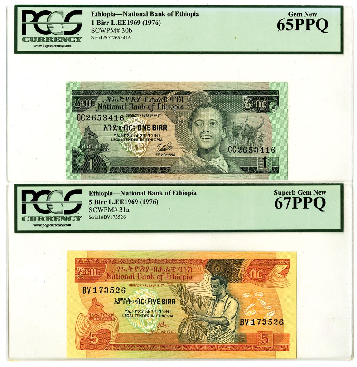 Ethiopia, L.EE1969 (1976). Lot of 2 Issued Banknotes, Includes: 1 Birr, P-30b, S/N CC2653416, PCGS graded Gem New 65PPQ; 5 Birr, P-31a, S/N BV173526, PCGS graded Superb Gem New 67PPQ. (2). Sold "AS IS" no returns accepted.