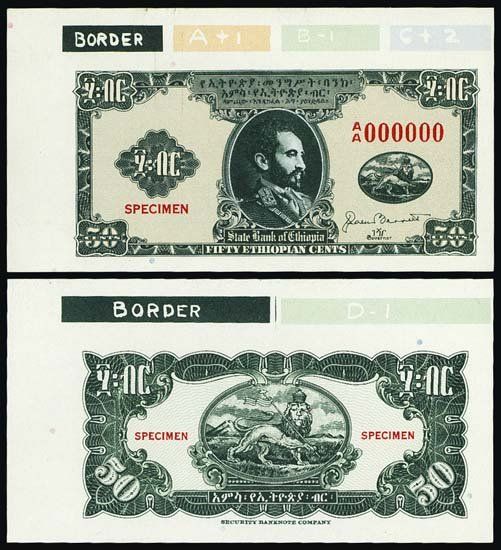 (ca.1940-50's). P-Unlisted Uniface specimen notes. Face and back are green with either very light beige or green undertint. Red specimen overprints and "00000" serial numbers. Similar to the 1945 series with vignette of Haile Selassie in middle but no scenery vignette. Arms on back. Essay uniface front and back uniface specimens. Backs of face and back have "Approved_______" and place for approval signature. These notes have no approval signatureon back. Large top margins with color bars on top. Gem Uncirculated condition. SBNC. Only 2 notes of each color were found.