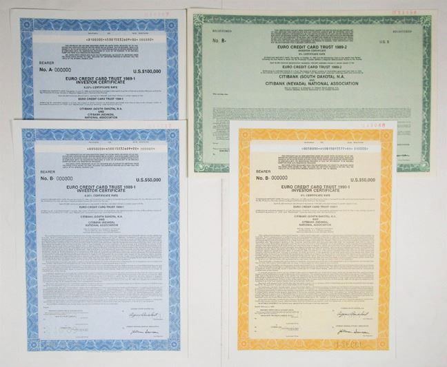 1989-90. Lot of 4 Specimen Certificates, Includes: Registered 9% Investor Cert with Green border; $50,000 Coupon 9.25% Investor Cert with Blue border; $100,000 Coupon 9.25% Investor Cert with Blue border; $50,000 Coupon 9% Investor Cert with Yellow/Orange border. All pieces are pin punched Specimen, Uncirculated condition, all were printed by SC-USBNC. (4). Sold "AS IS" no returns accepted.