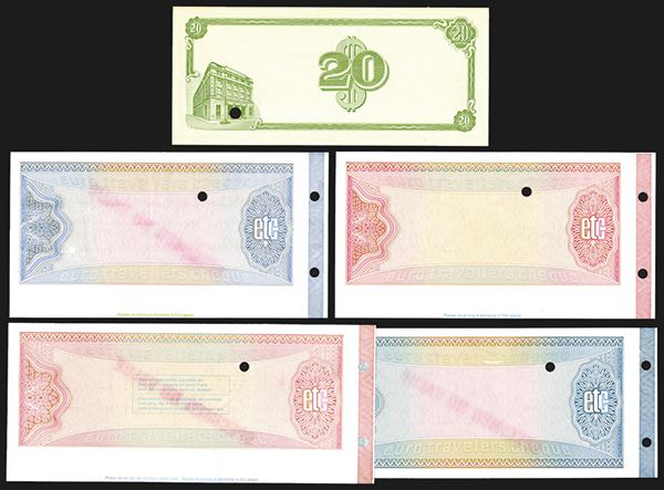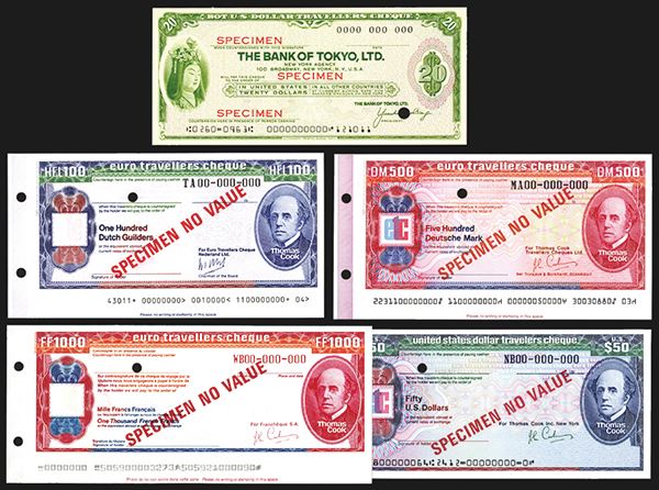 Japan, Germany, France, U.S.A., Netherlands, Japan. 19xx (ca. 1980-90's). All are specimens with Overprints and POC's. Includes 4 different Thomas Cook Traveler's Checks. Denominations range from DM500; $50, FF1000; 100 DG's. All are in Uncirculated to CU condition. Attractive and colorful. B&W, G&D and Government Printing Bureau, Tokyo.