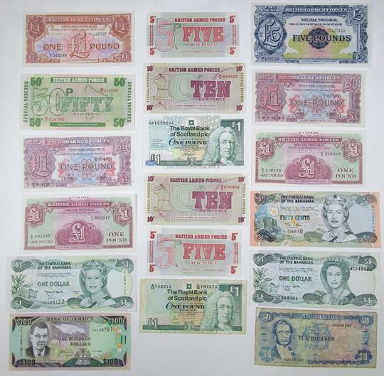 British Armed Forces....., Fiji, Bahamas, Scotland, Papua New Guinea, Jamaica, Zimbabwe, Rhodesia, Gibraltar, England, Ireland, Isle of Man, Cayman Islands, & East Caribbean, 1979-2010. Lot of 35+ Issued Banknotes, Includes: 11 Banknotes from British Armed Forces; 1 Banknote from Reserve Bank of Fiji; 3 Banknotes from Central Bank of the Bahamas; 2 Banknotes from the Royal Bank of Scotland plc; 4 Banknotes from Bank of Papua New Guinea; 4 Banknotes from Bank of Jamaica; 1 Banknote from Reserve Bank of Zimbabwe; 3 Banknotes from Reserve Bank of Rhodesia; 1 Banknote from Government of Gibraltar; 2 Banknotes from Bank of England; 1 Banknote from Bank of Ireland; 1 Banknote from Isle of Man Government; 1 Banknote from Cayman Islands Monetary Authority; and 2 Banknotes from East Caribbean Currency Authority. (35+) Please inspect. Sold "AS IS" no returns accepted.
