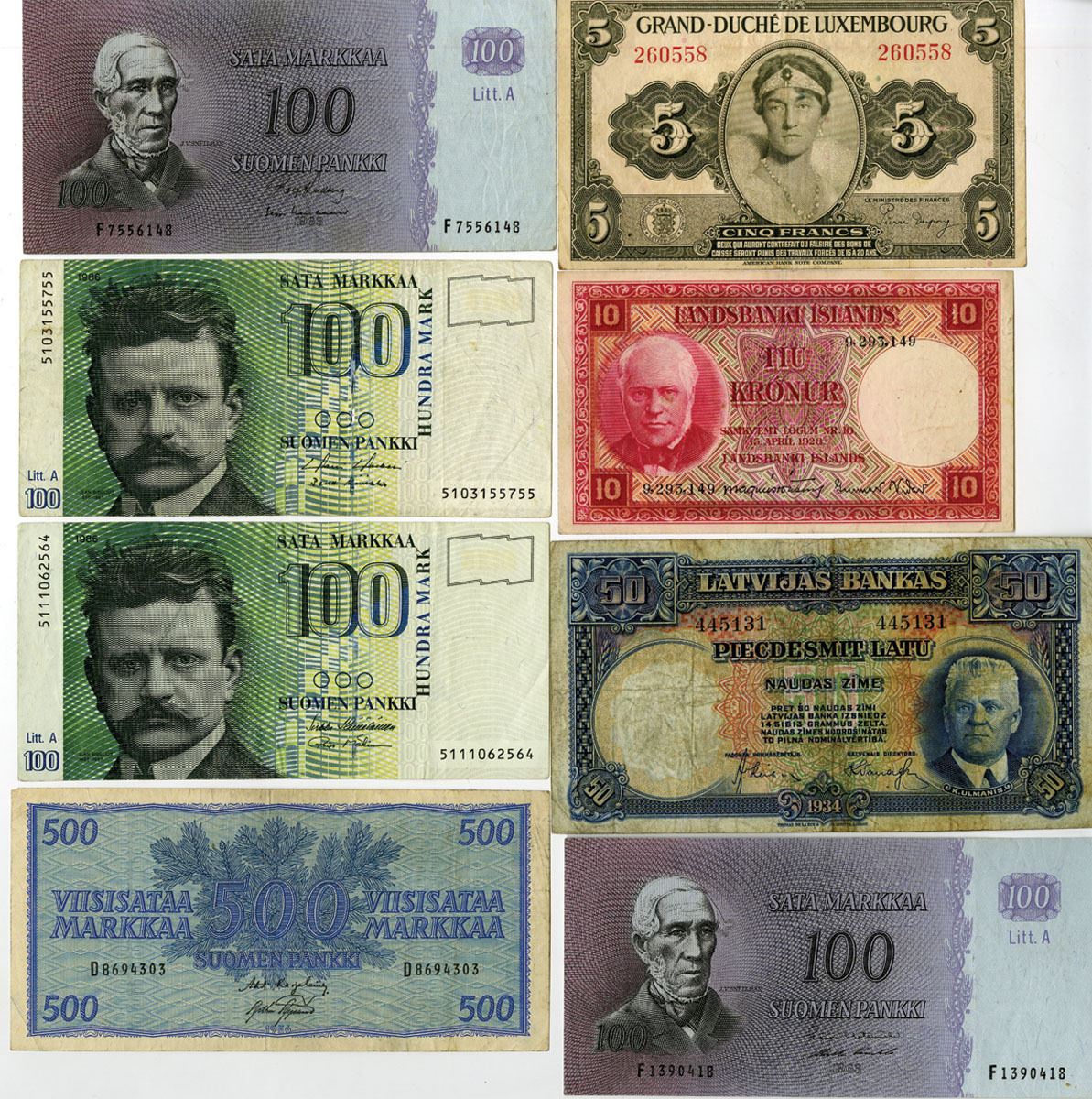 Europe, 1934 to 1986. Lot of 8 Issued Banknotes, Includes: 1956, Finlands Bank 500 Markka, P-96a; 1963, 100 Markkaa, P-106a (2); 1986, 100 Markkaa, P-115a (2); L. 1928 (1948-1956) Landsbanki Islands 10 Kronur, P-33a, BWC; 1934, Bank of Latvia 50 Latu, P-20a, TDLR; ND (1944) Grand Duche de Luxembourg 5 Francs, P-43a, ABNC. Notes range from Fine to XF condition. (8). Sold "AS IS" no returns accepted.