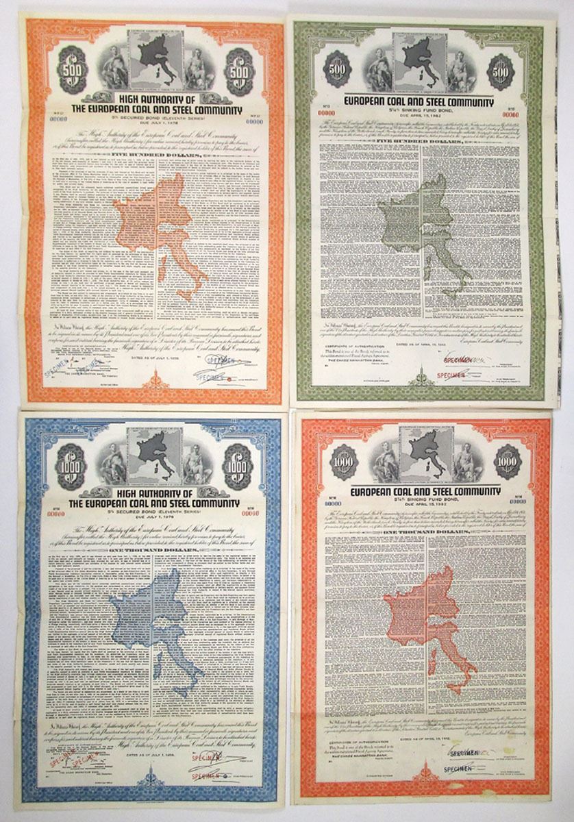 Europe, 1958 to 1962, Lot of 4 Specimen Bonds, Includes: 1958, $500 5% Eleventh Series Secured Coupon Bond, Black with orange border; 1958, $1000 5% Eleventh Series Secured Coupon Bond, Black with blue border; 1962, $500 5 1/4% Sinking Fund Coupon Bond, Black with green border; 1962, $1000 5 1/4% Sinking Fund Coupon Bond, Black with orange border. All have map of Europe at top flanked by allegorical men, Specimen overprints, POCs, are XF to AU condition, printed by ABNC. (4). Sold "AS IS" no returns accepted.