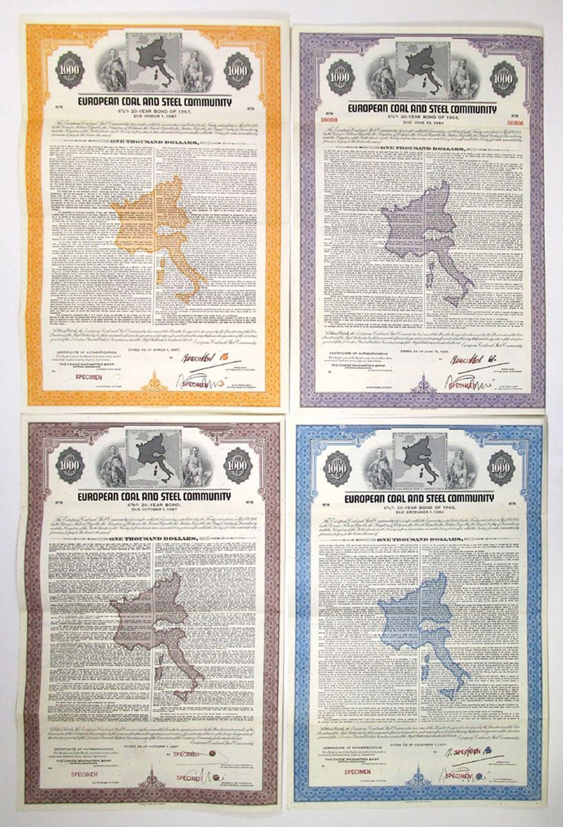 Europe, 1966 to 1967, Lot of 4 Specimen Bonds, Includes: 1966, $1000 6 /12% 20 Year Coupon Bond, Black with blue border; 1966, $1000 6 /12% 20 Year Coupon Bond, Black with purple border; 1957, $1000 6 /12% 20 Year Coupon Bond, Black with yellow/orange border; 1967, $1000 6 /12% 20 Year Coupon Bond, Black with brown border. All have map of Europe at top flanked by allegorical men, Specimen overprints, POCs, are XF to AU condition, printed by ABNC. (4). Sold "AS IS" no returns accepted.