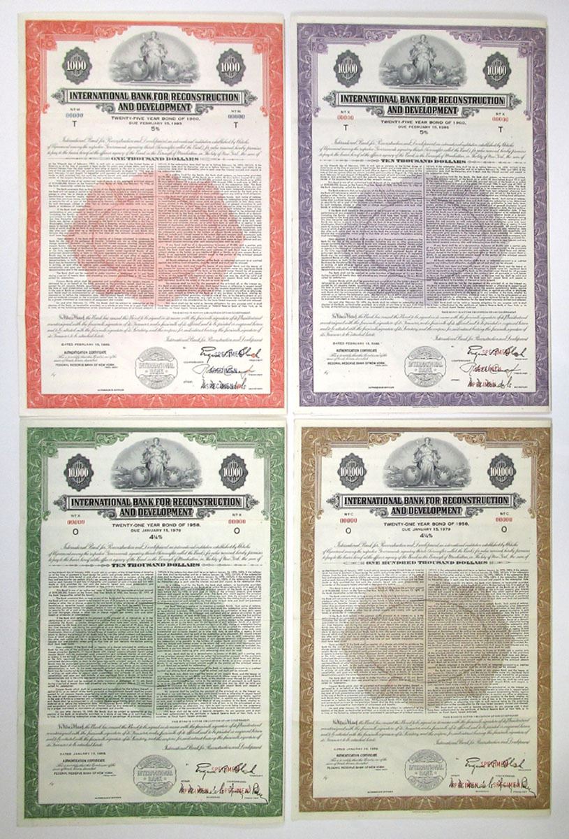 Europe, 1958 to 1960, Lot of 4 Specimen Bonds, Includes: 1958, $10,000 4 1/4% Twenty One Year Coupon Bond, Black with green border; 1958, $100,000 4 1/4% Twenty One Year Coupon Bond, Black with brown border; 1960, $1000 5% Twenty Fine Year Coupon Bond, Black with orange border; 1960, $10,0000 5% Twenty Fine Year Coupon Bond, Black with purple border. All have same vignette of allegorical woman between two globes, Specimen overprints, POCS, are in XF to AU condition, printed by ABNC. (4). Sold "AS IS" no returns accepted.
