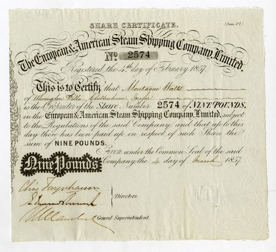 England and U.S., 1857, 1 Share I/U Stock Certificate, Black print without any border, Company title at top, VF-XF condition. The European & American Steam Shipping Company was founded in 1857 with the purchase of eight iron screw steamers from the General Screw Steam Shipping Company, which were paid for with shares in the new concern. The new company was managed by T.R. Croskey, American Consul at Southampton. Four of the ships the GOLDEN FLEECE, HYDASPES, CALCUTTA and the LADY JOCELYN were used for a service to South America, and the remainder the QUEEN OF THE SOUTH, INDIANA, ARGO and JASON were placed in a fortnightly service between Bremen, Southampton and New York. The service from Europe to North America was merely a repetition of the General Screw Steam Shipping Company and the QUEEN OF THE SOUTH, INDIANA, ARGO and JASON in that order sailed between Bremen, Southampton and New York at fortnightly intervals starting on 25 April 1857. The sailings were interspersed between those of the wooden paddle steamers of the American owned Ocean Navigation Company and the New York & Havre Steam Navigation Company on the New York - Southampton - Le Havre route.