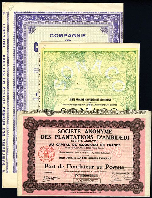 Societe Congolaise Par Actions a Responsabilite Limitee Series B #48341, Societe Anonyme des Plantations D'Ambidedi #000763, Compagnie des Grands Hotels du Katanga #04650 (1928)
